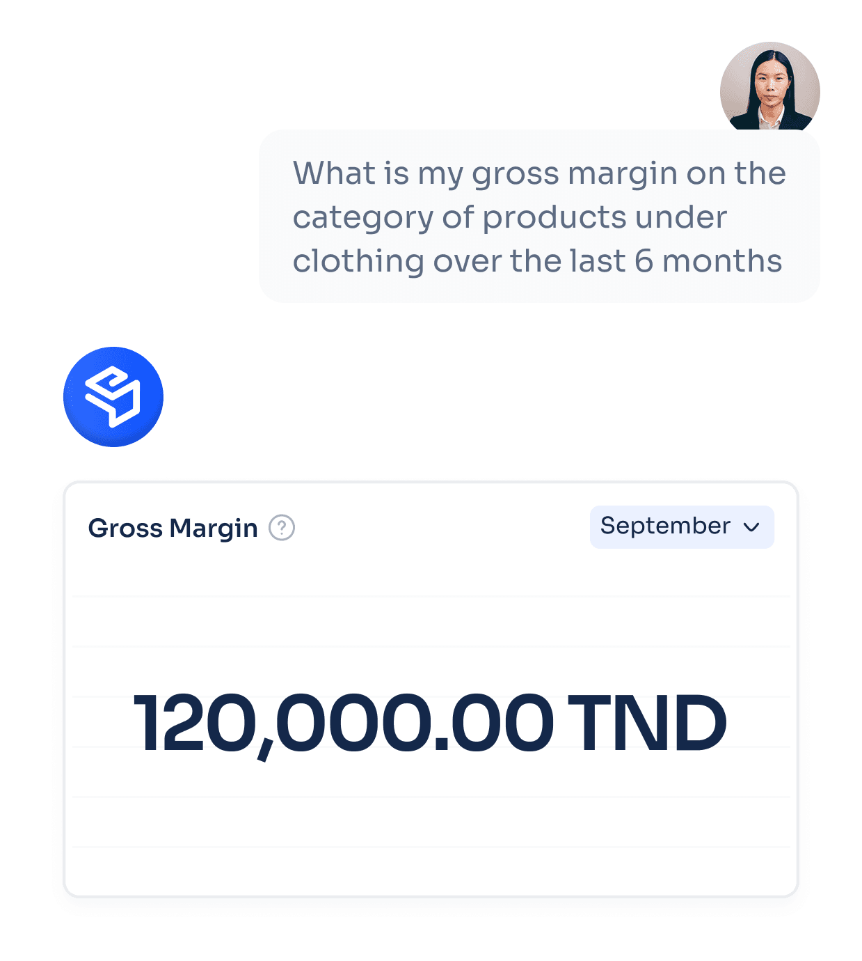 وكلاؤنا بالذكاء الاصطناعي يمكنهم توليد ملخّصات تقارير عن المبيعات، والهامش الإجمالي، والمنتجات الأكثر مبيعًا، وغيرها من المقاييس الأساسية.