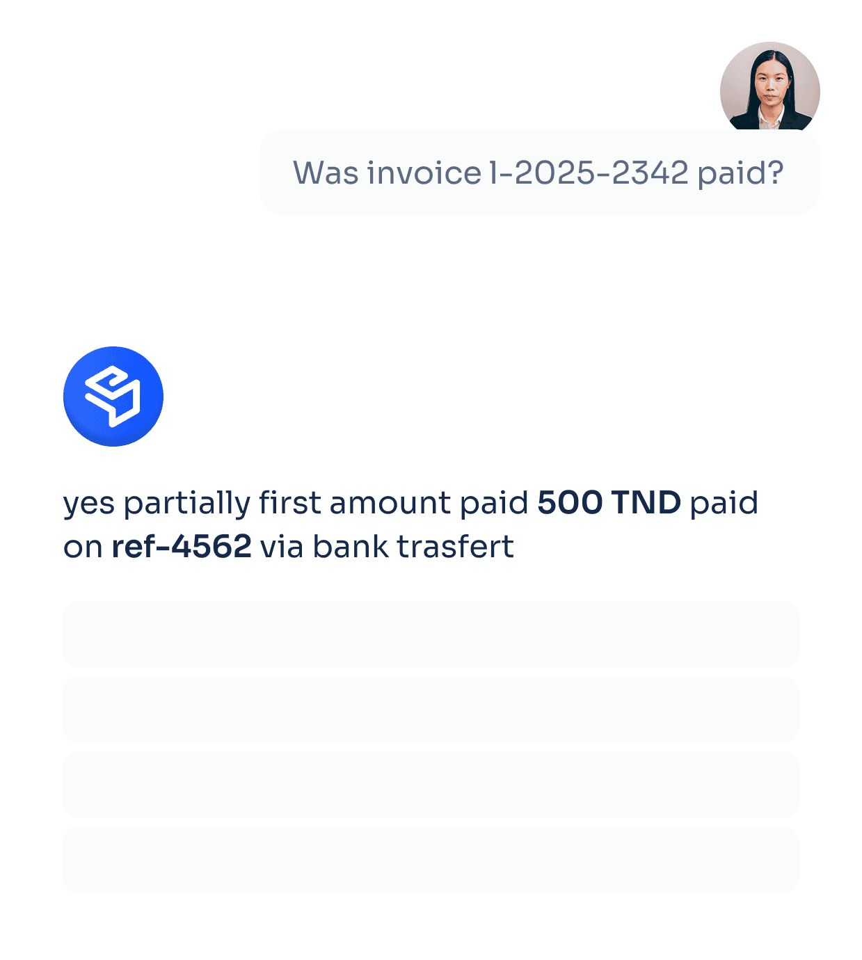 وكلاؤنا بالذكاء الاصطناعي يمكنهم جلب أي معلومة حول الفواتير، والمشتريات، والموظفين، والمخزون، والمصاريف، وغيرها.